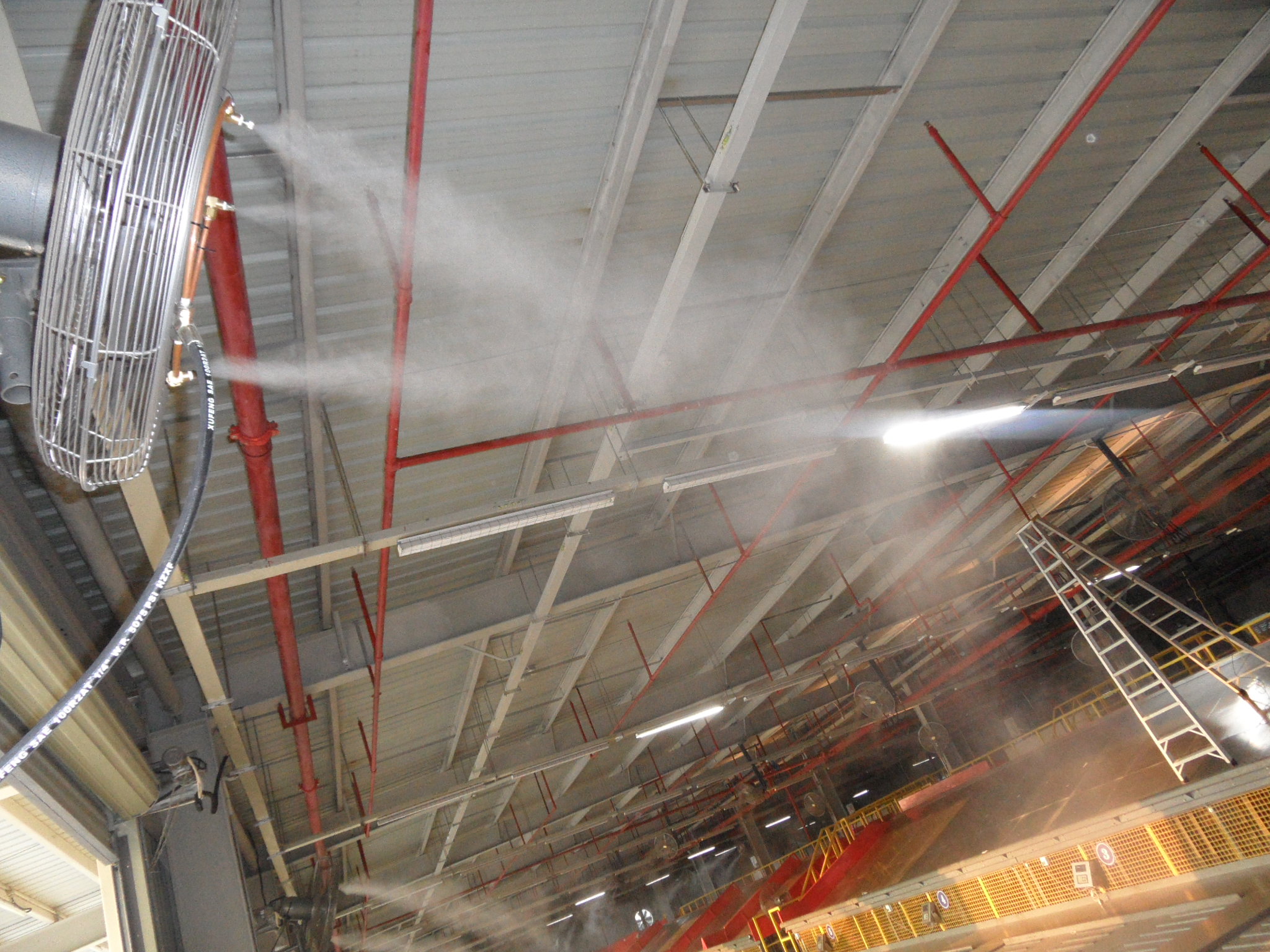 噴霧降溫展示 5.電風(fēng)扇:常見的有吊扇、牛角扇、壁扇、臺(tái)扇、落地扇等,這一類設(shè)備優(yōu)點(diǎn)是單臺(tái)購(gòu)買投資比較小,用電較省,維修保養(yǎng)費(fèi)用低,缺點(diǎn)是效果差,安全性差。主要是利用風(fēng)扇扇葉轉(zhuǎn)動(dòng)的動(dòng)能攪動(dòng)熱空氣,引起氣流,不能實(shí)現(xiàn)通風(fēng)換氣,對(duì)排出有害氣體不良,造成車間通風(fēng)降溫工程效果差。